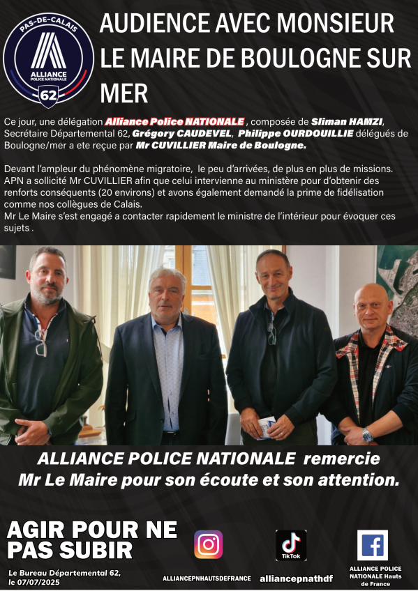 une délégation Alliance Police NATIONALE Alliance NATIONALE a été reçue par Monsieur le maire de Boulogne-sur-Mer concernant les effectifs et la prime de fidélisation...